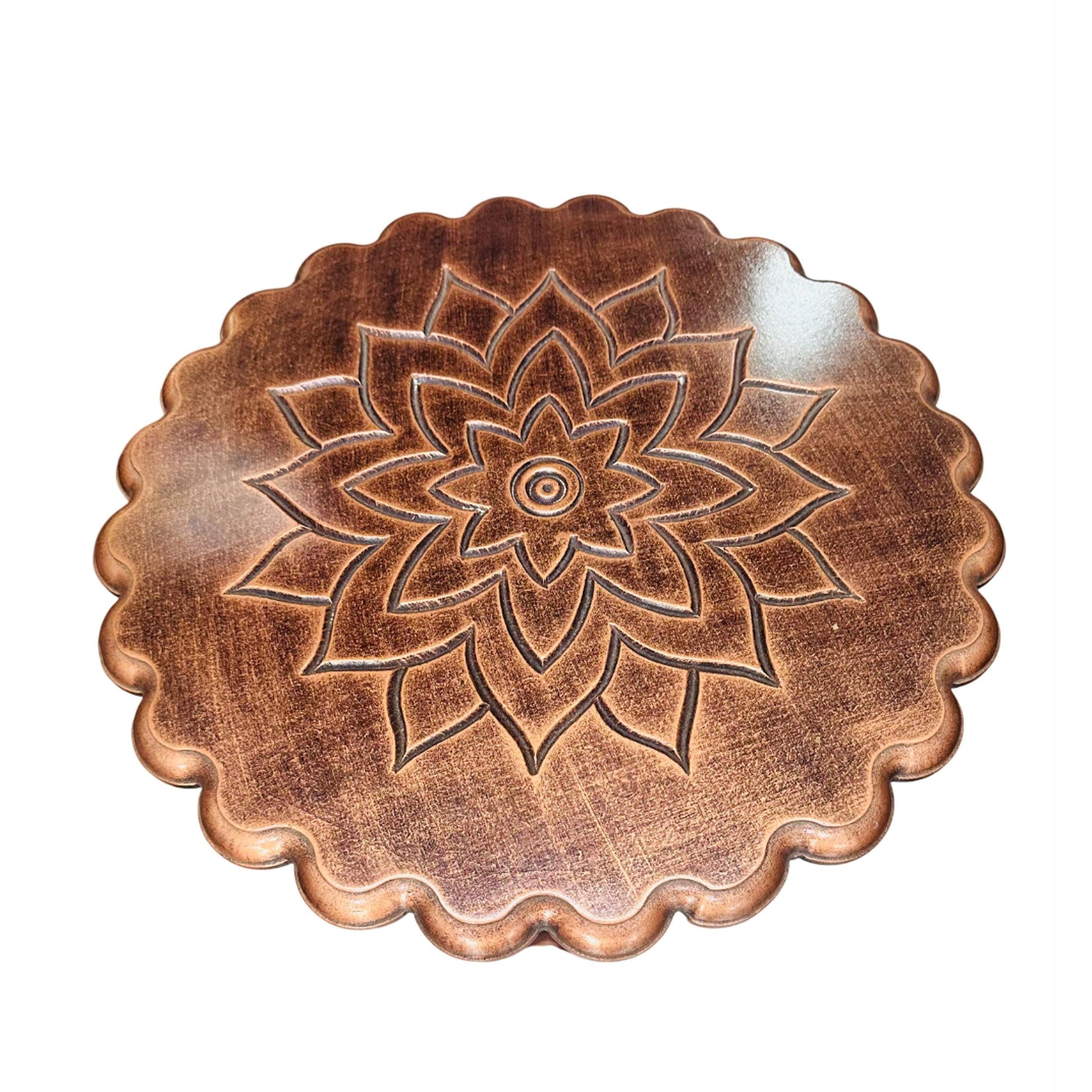 Hand Carved Mango Wood Coffee Table: lotus design, copper shade, folding design