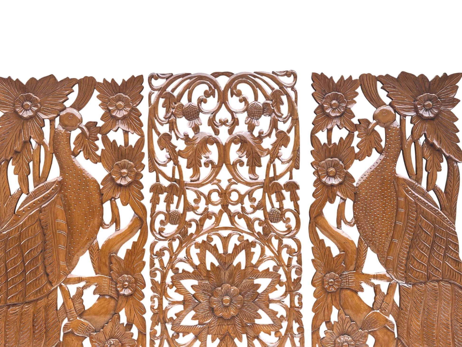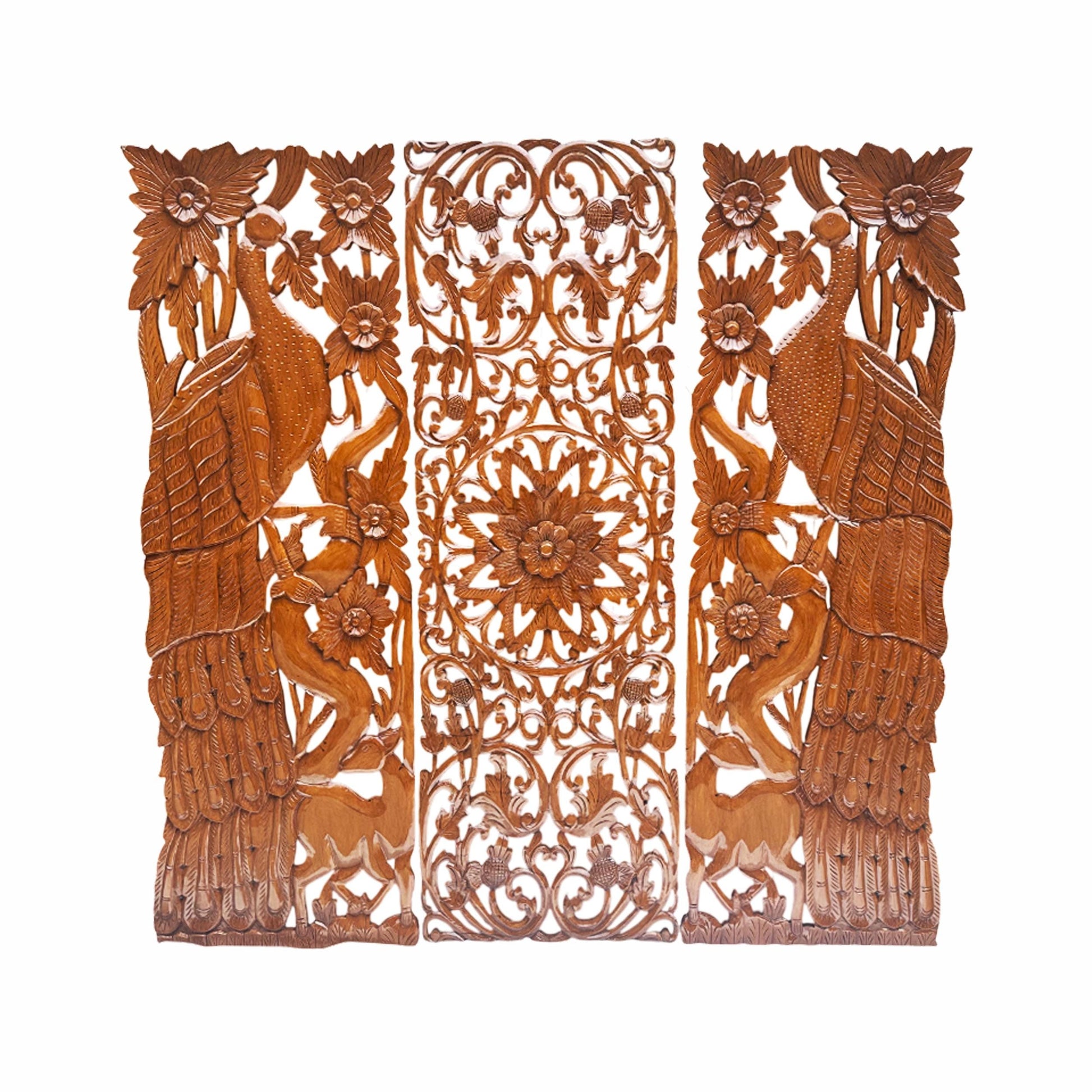 Hand Carved Wood Peacock & Flower Wall Decor - 7 ft Brown Hanging Fixture