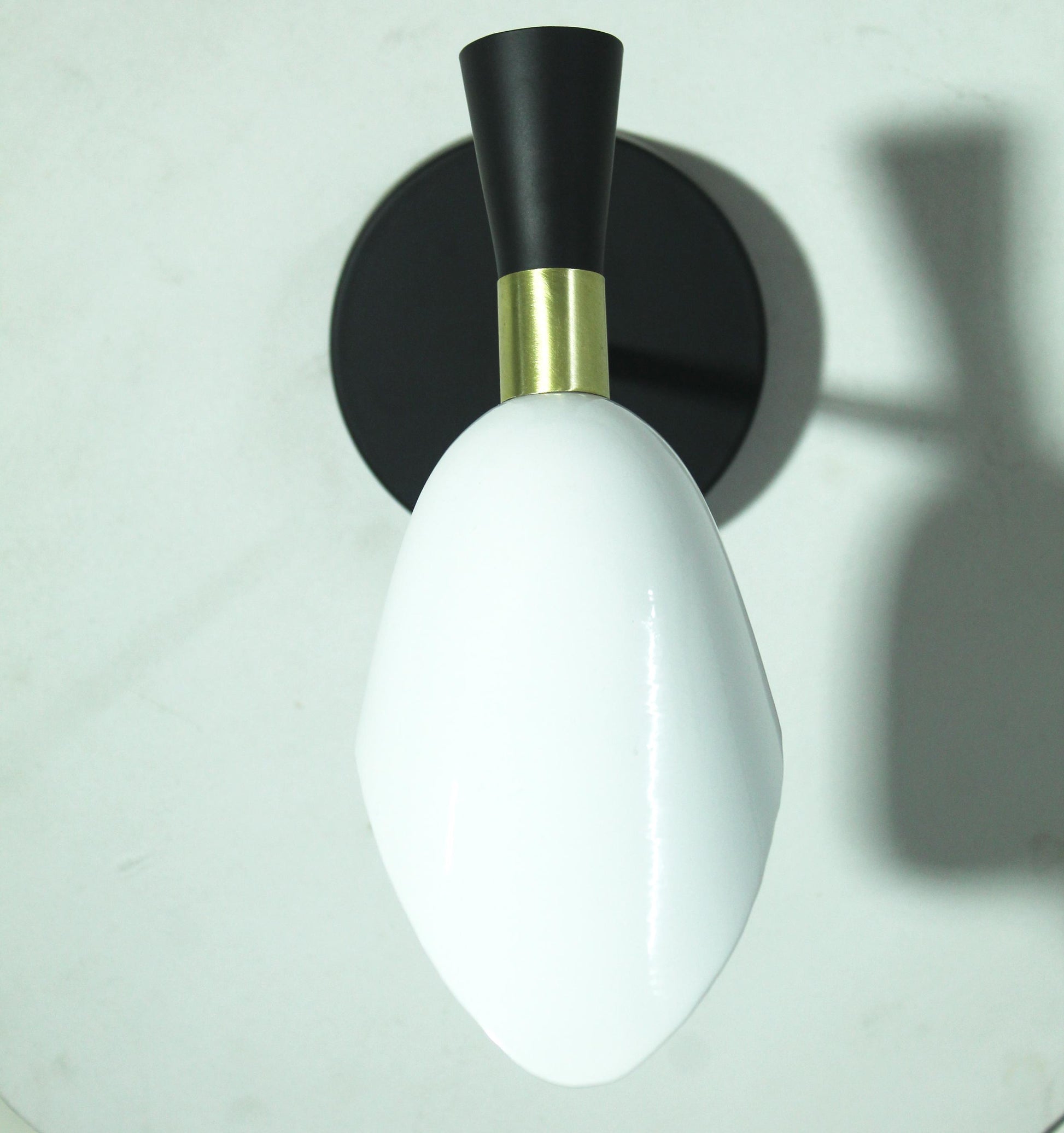 Pictured finish is brushed brass With matte black, white  shade and matte lack wall canopy