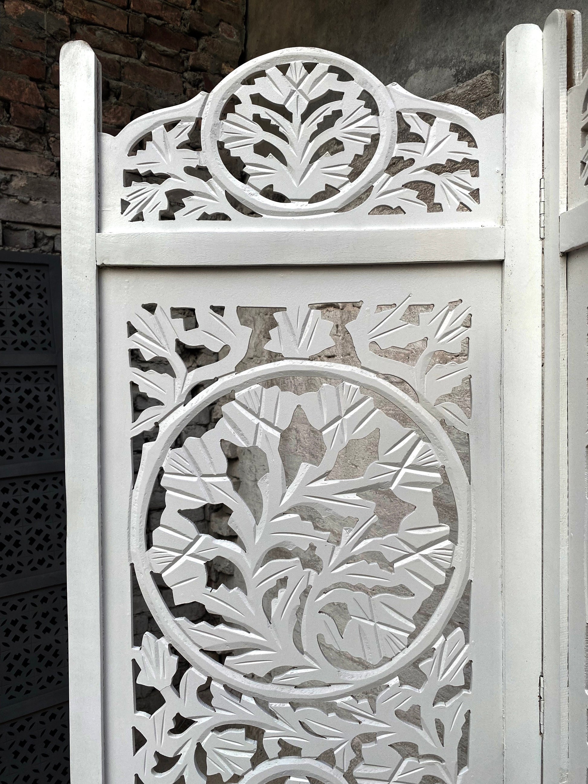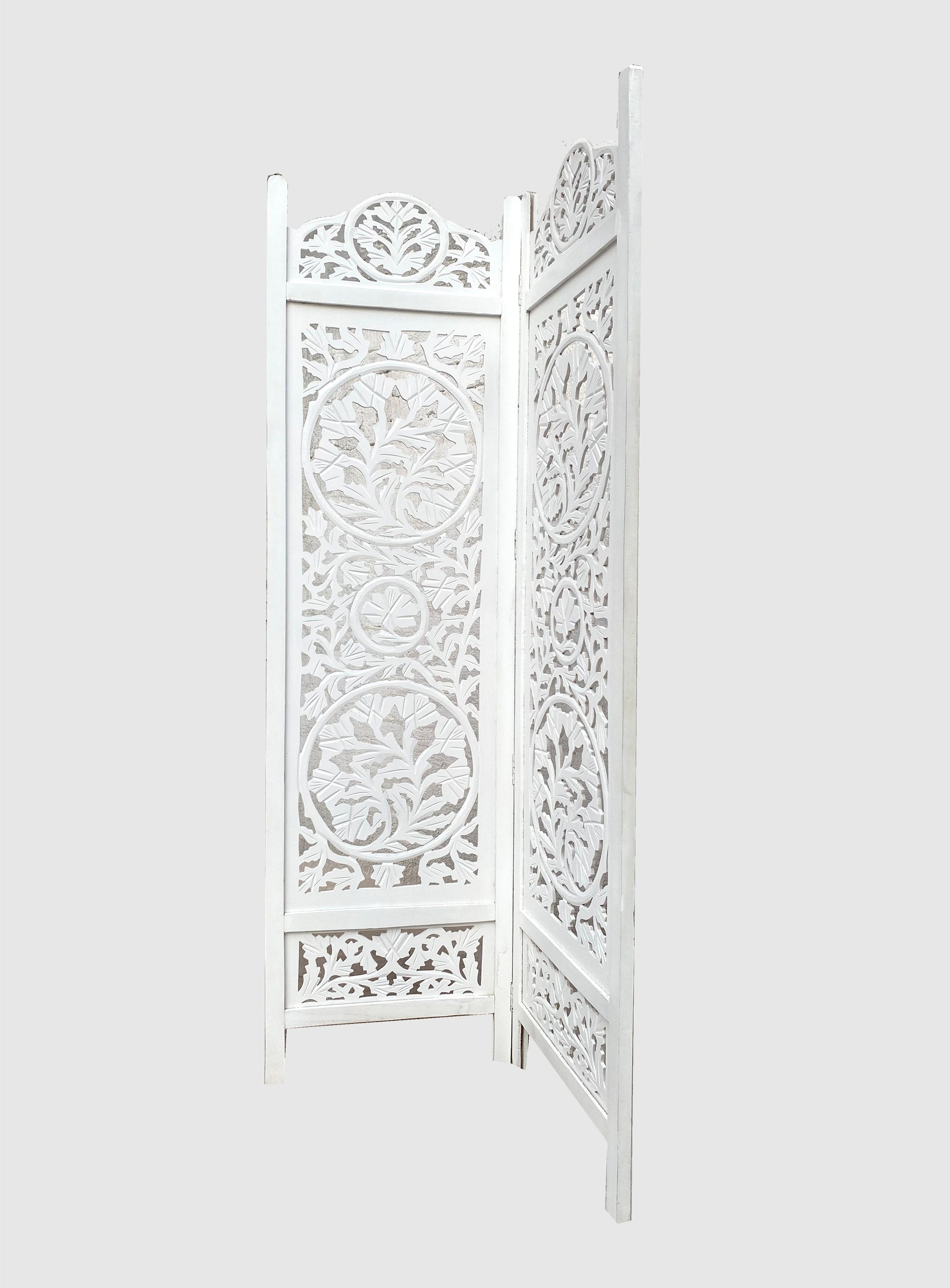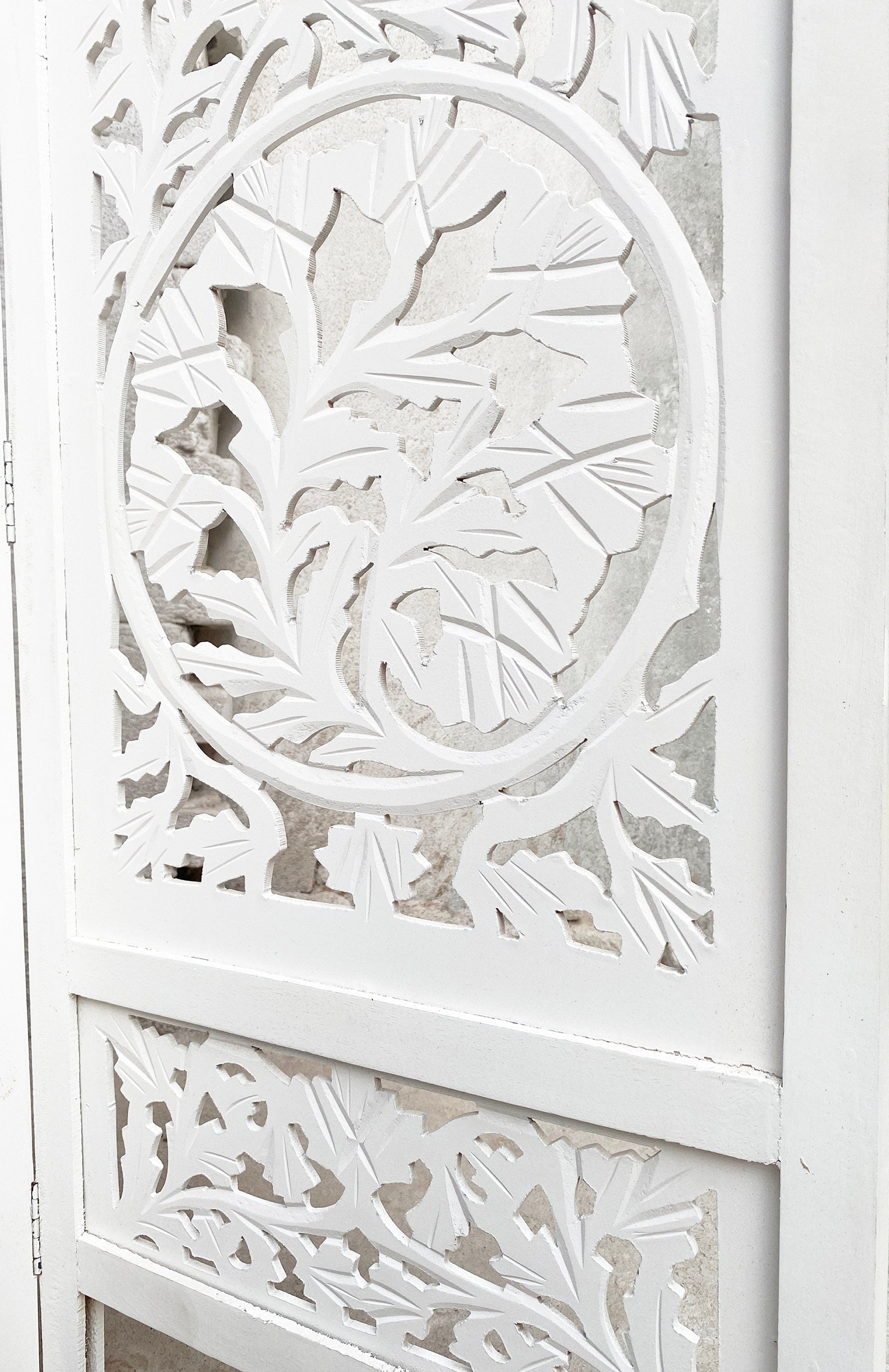 Handmade Lotus Wooden Folding Room Divider: White Carved Screen