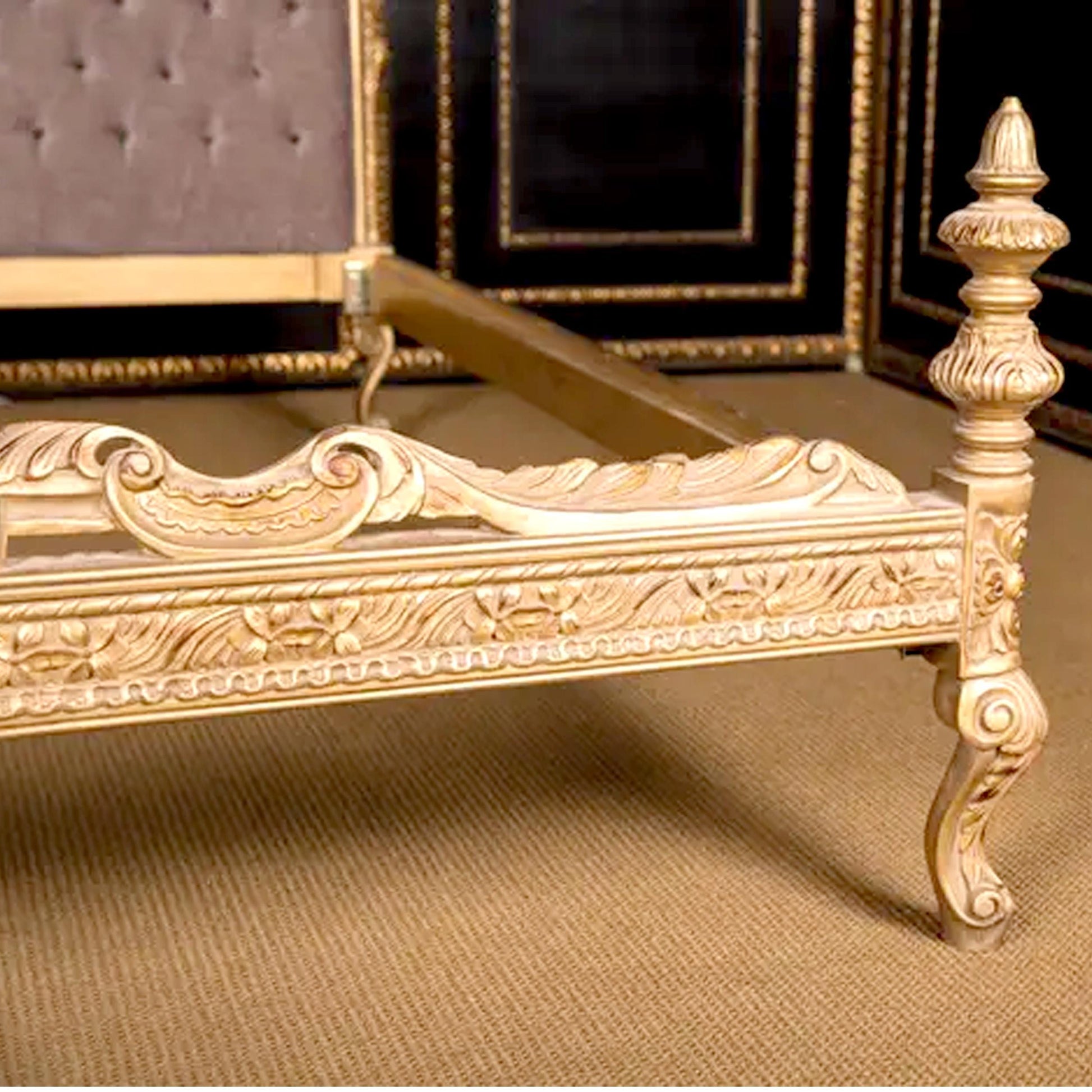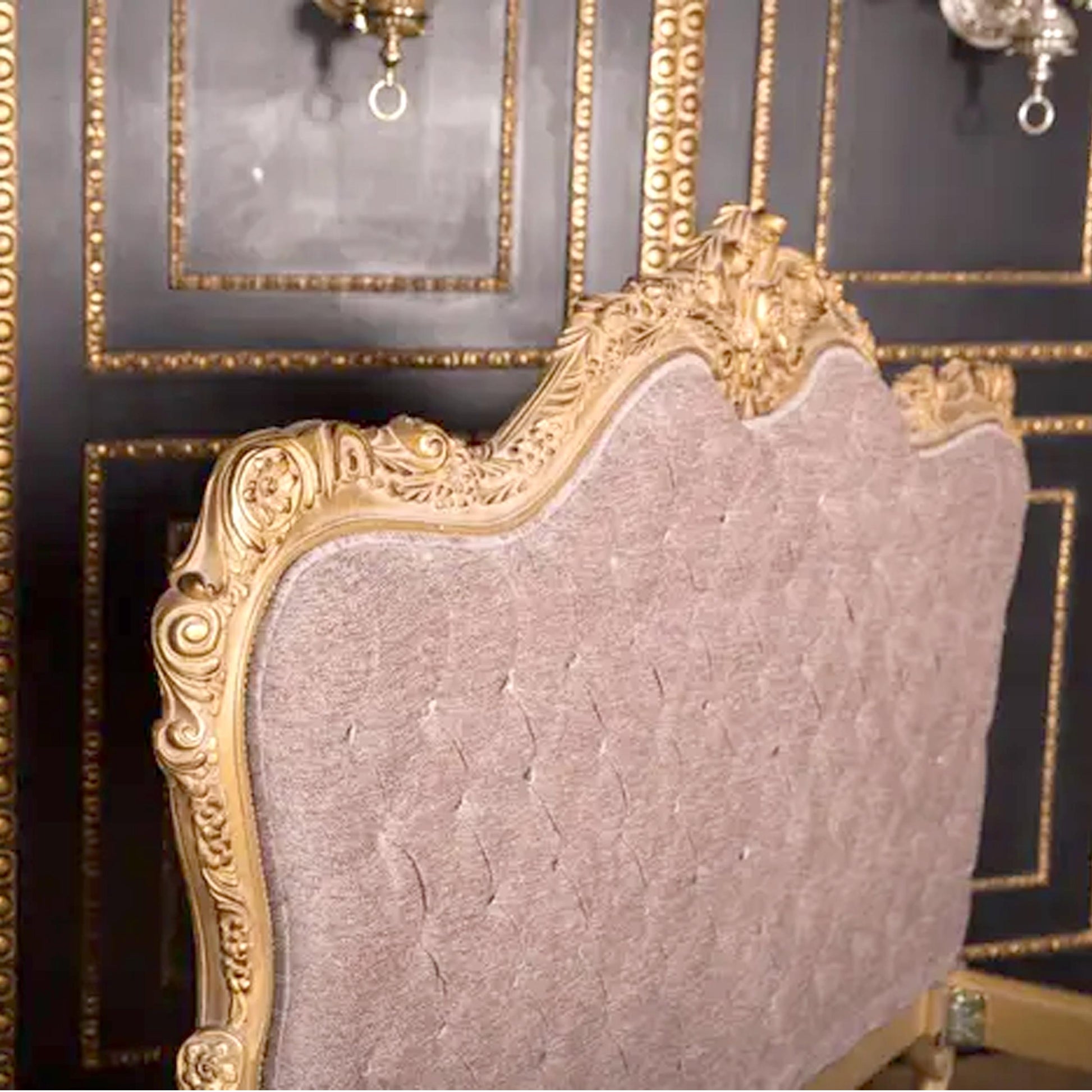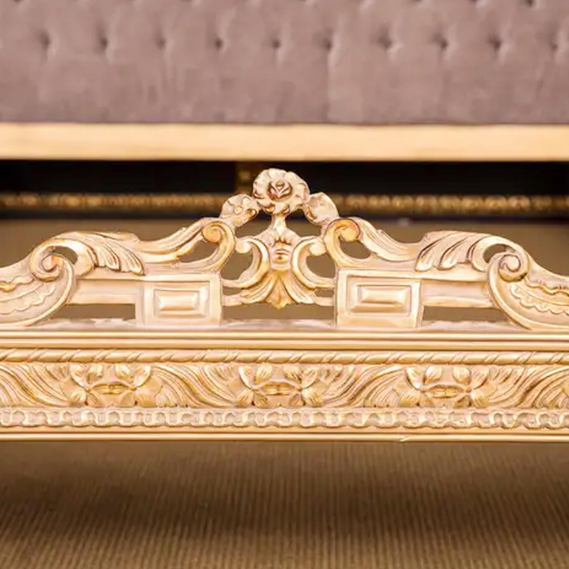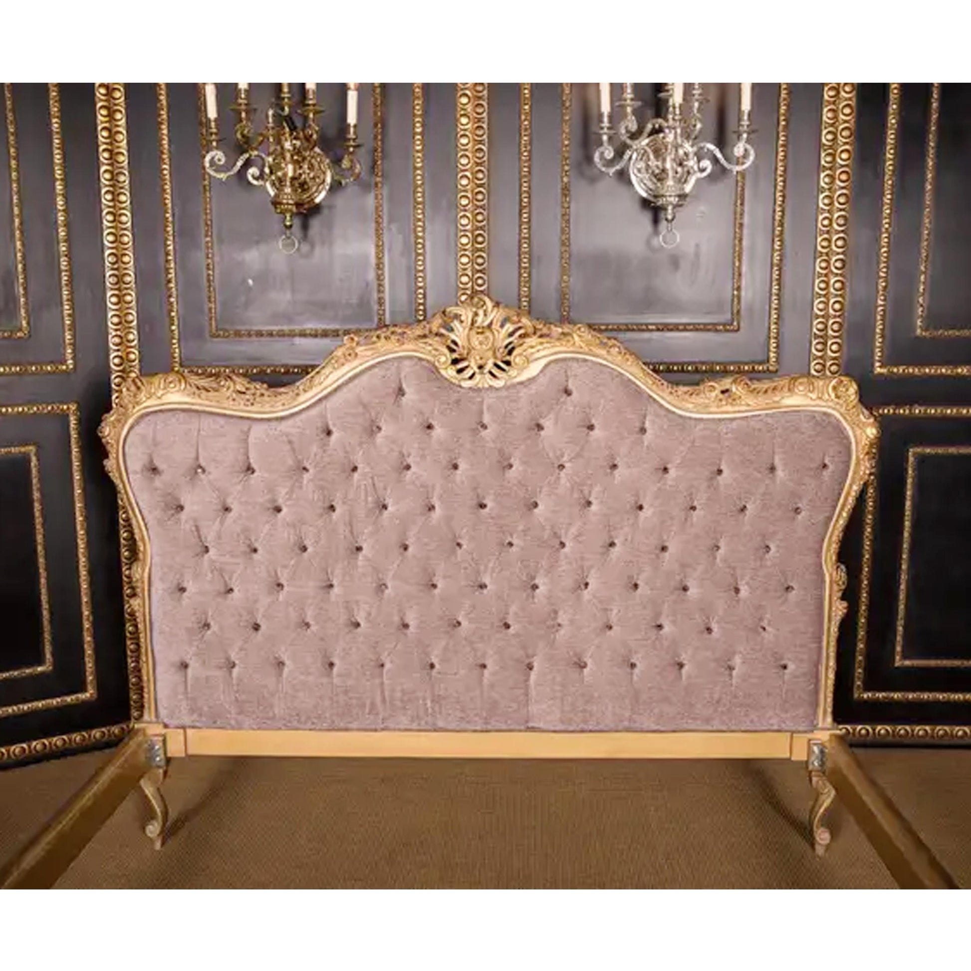 Handmade Louis XV Style Bed: Giltwood & Violet Tufted Headboard