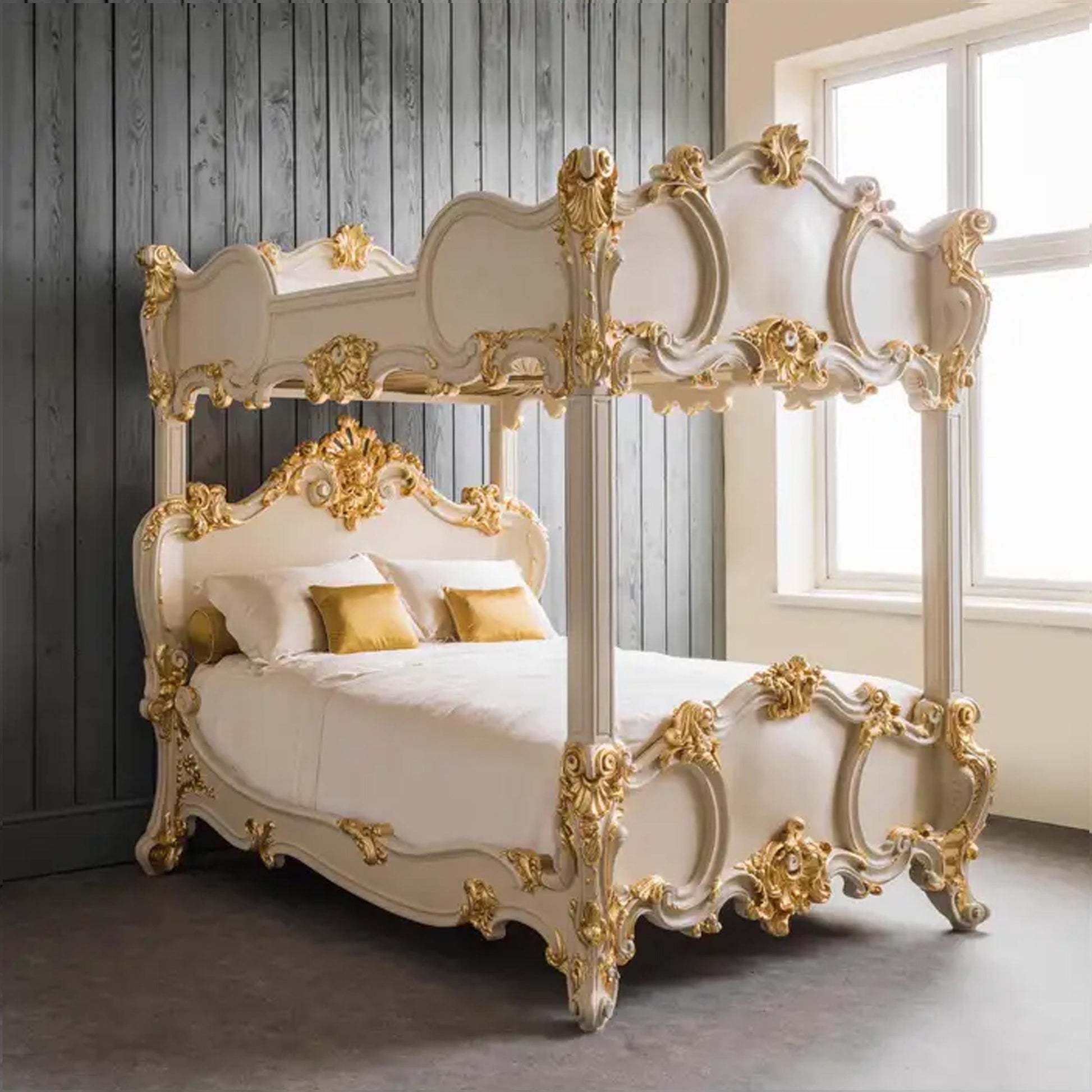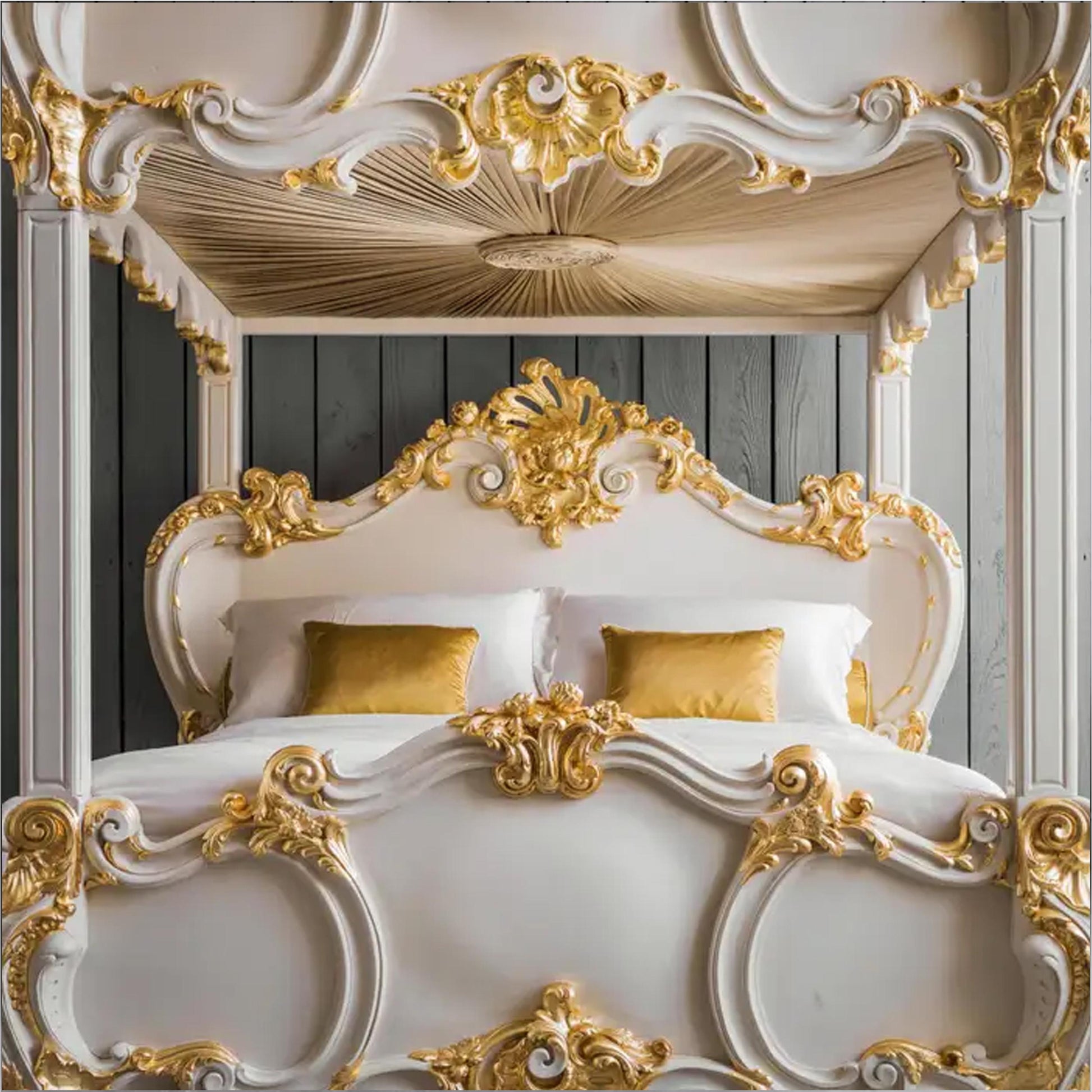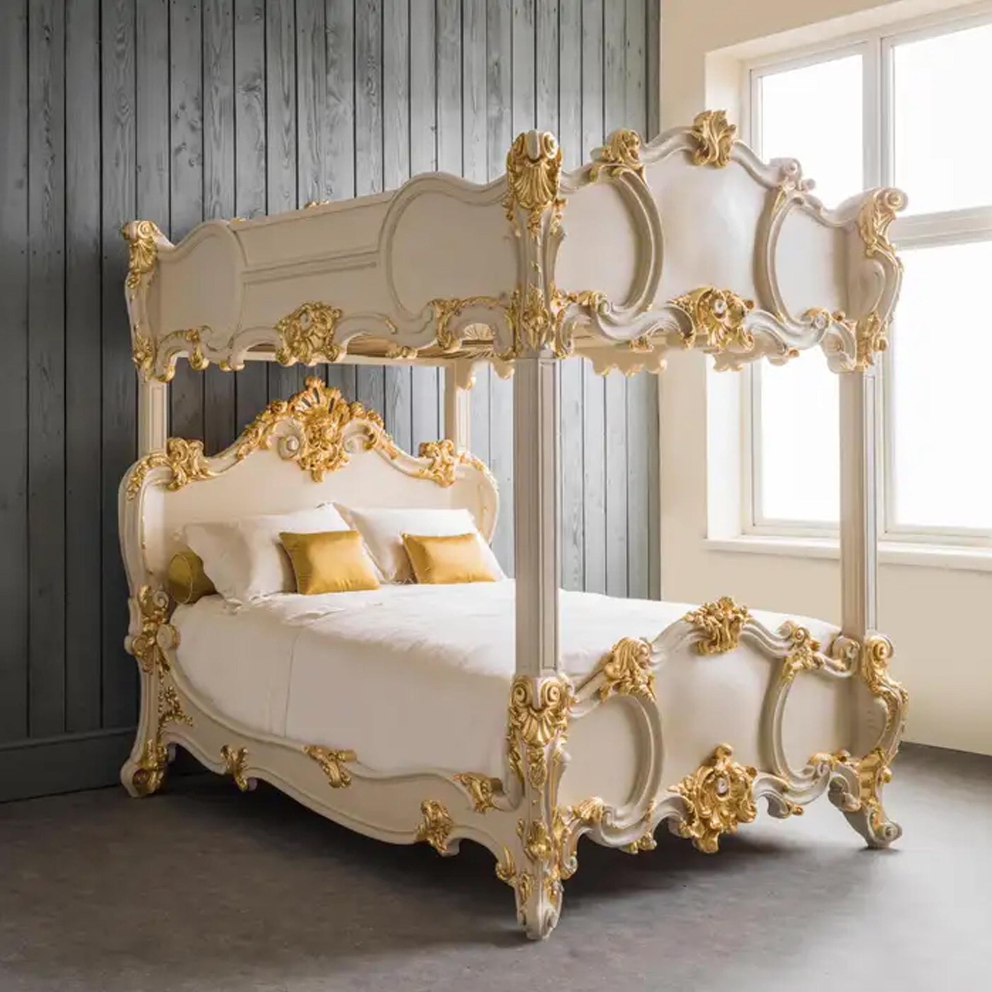 Handmade Rococo Style Four Poster Bed: Gold Gilt Wood Frame