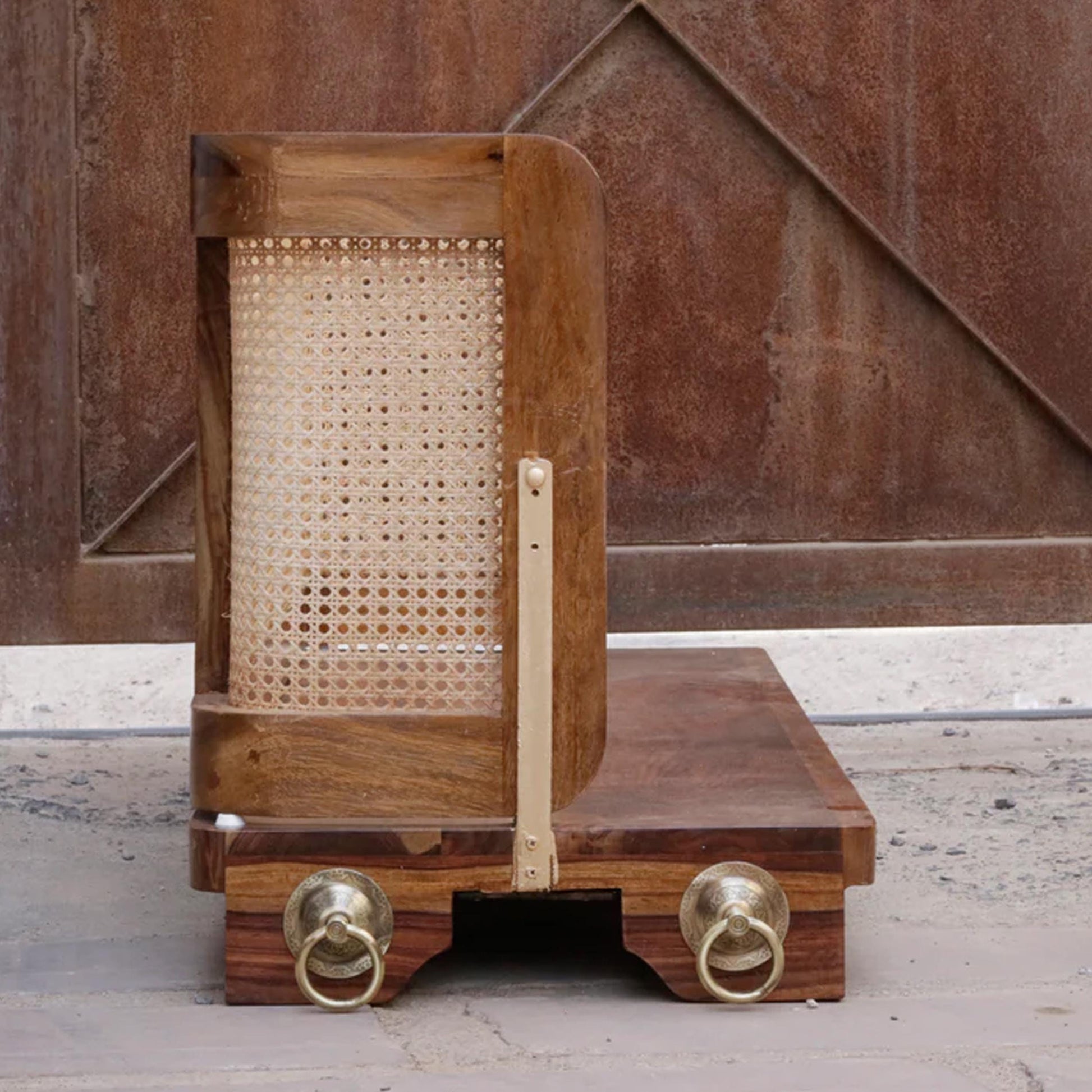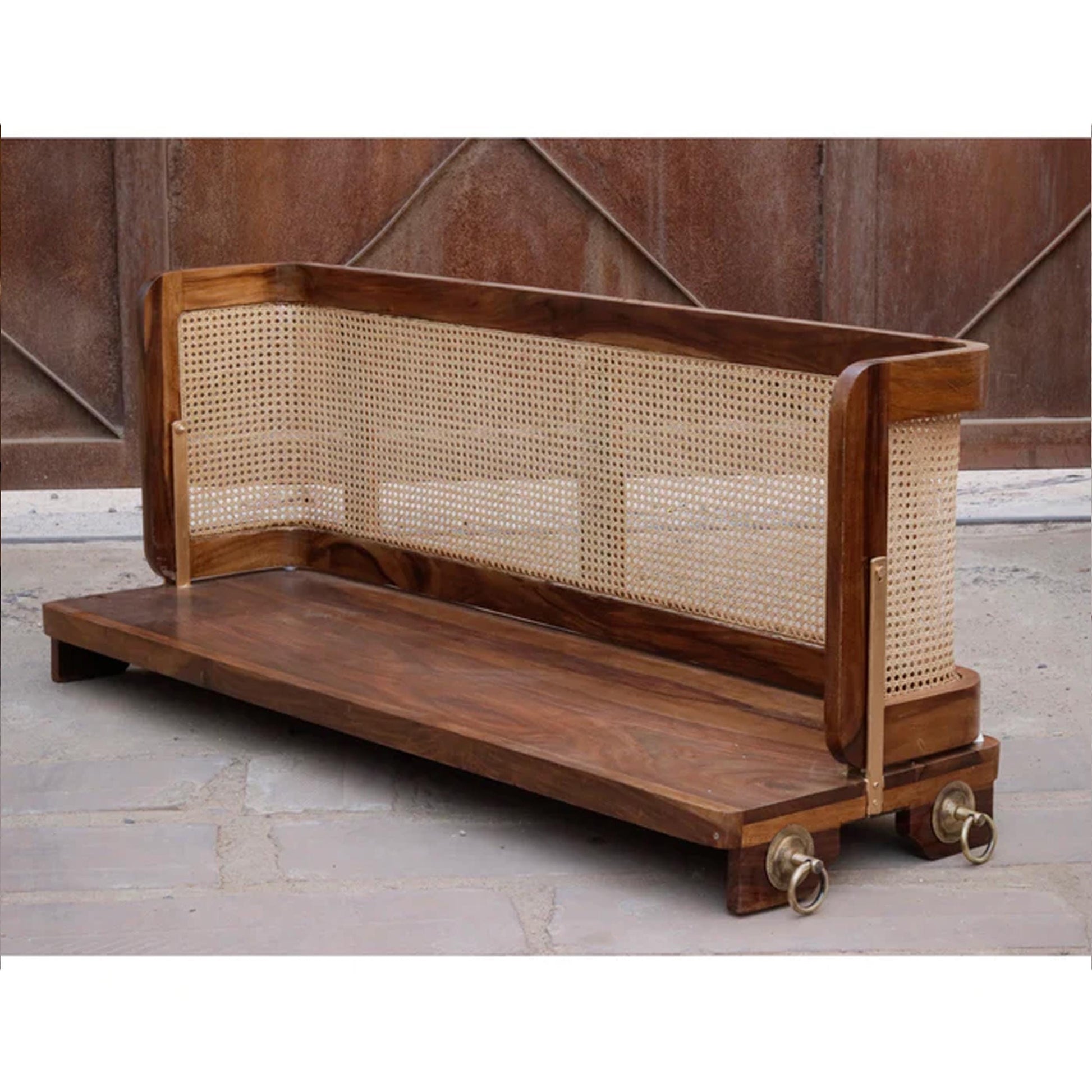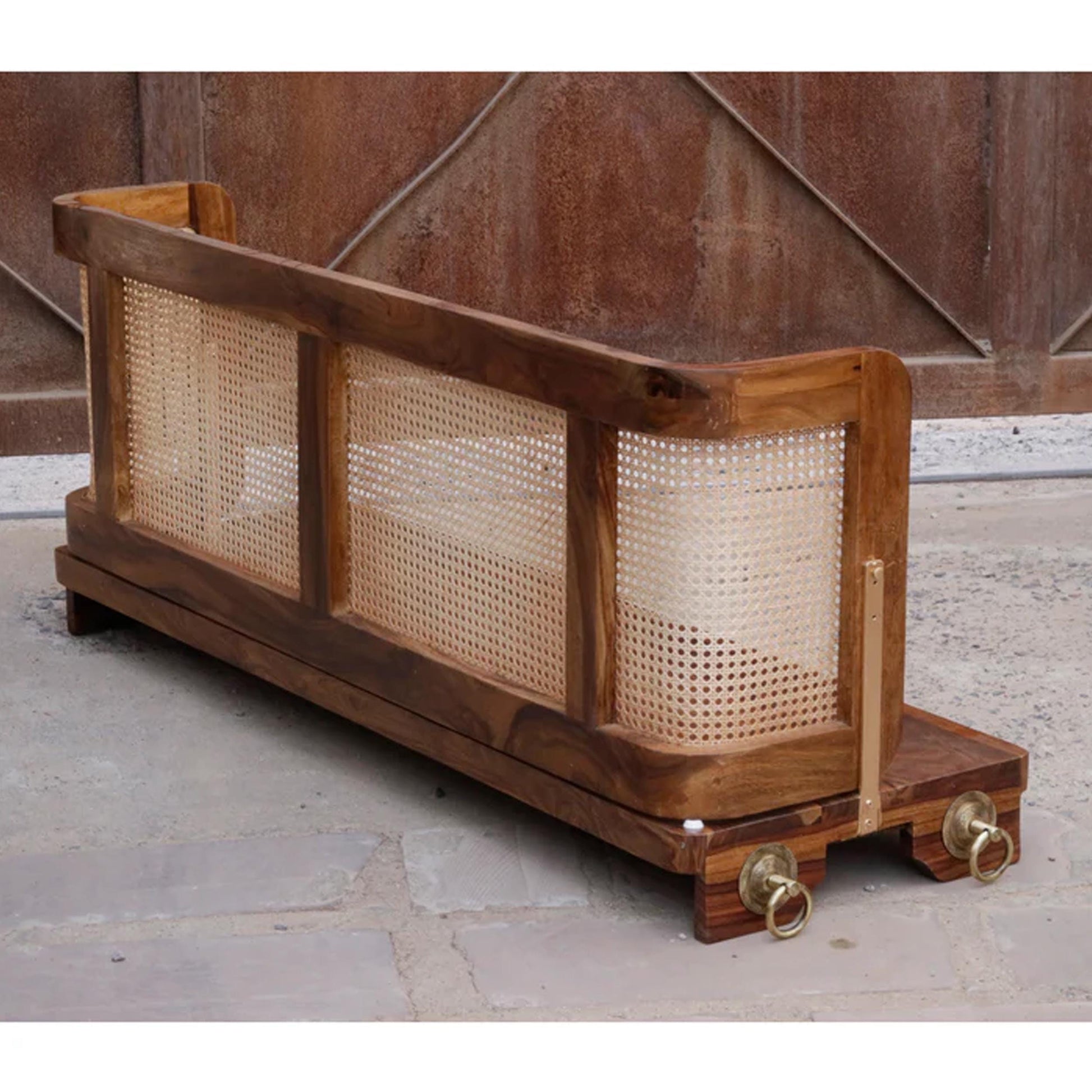 Handmade Teak Wood Hanging Swing: Brass Chain, Cane Back Rest