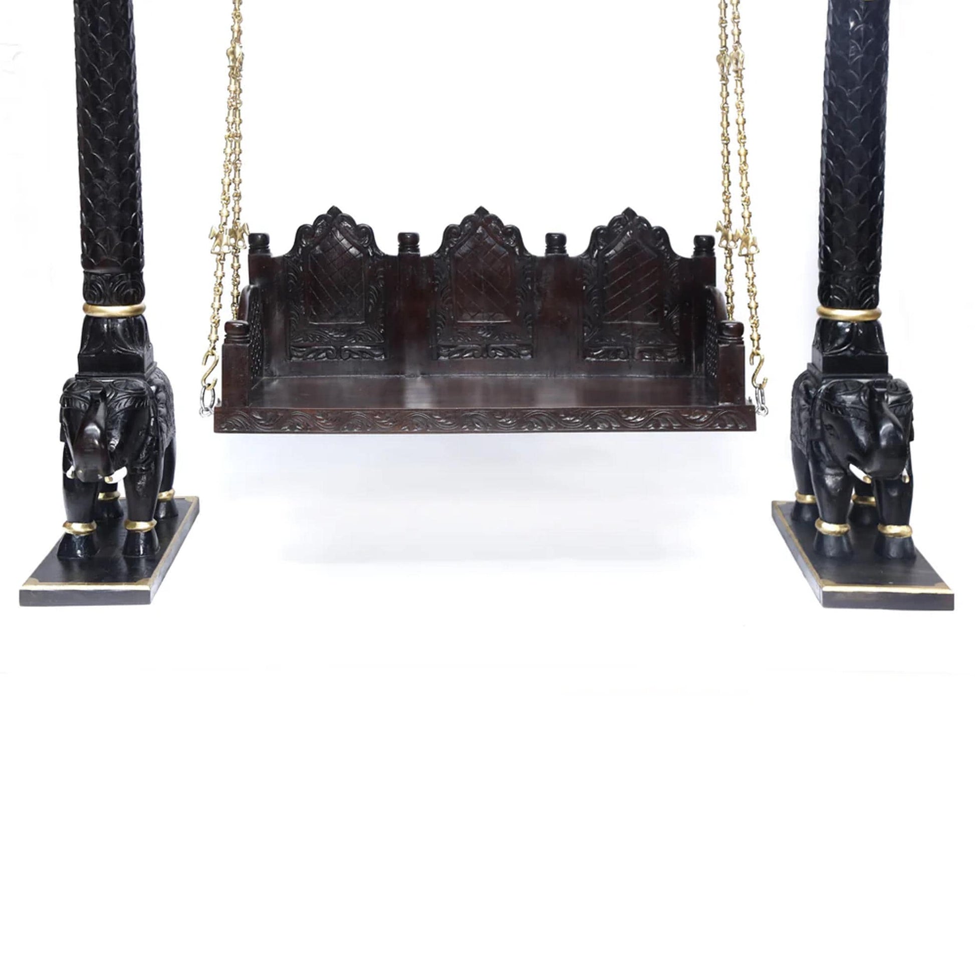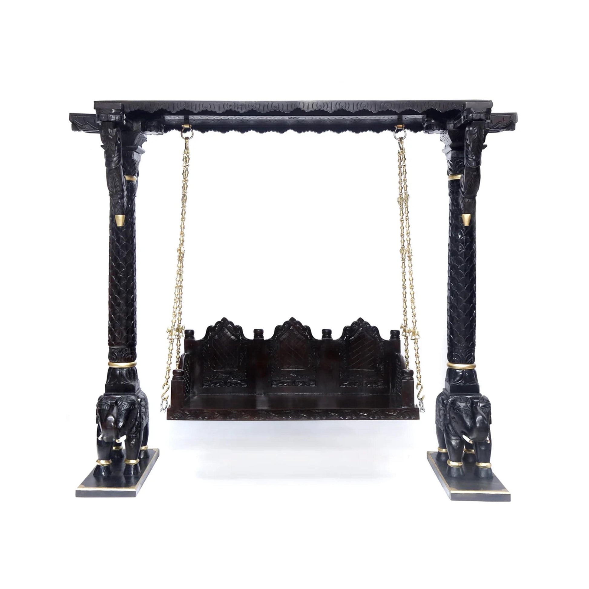 Handmade Teak Wood Swing: Elephant Carving, Brass Chain, Customizable