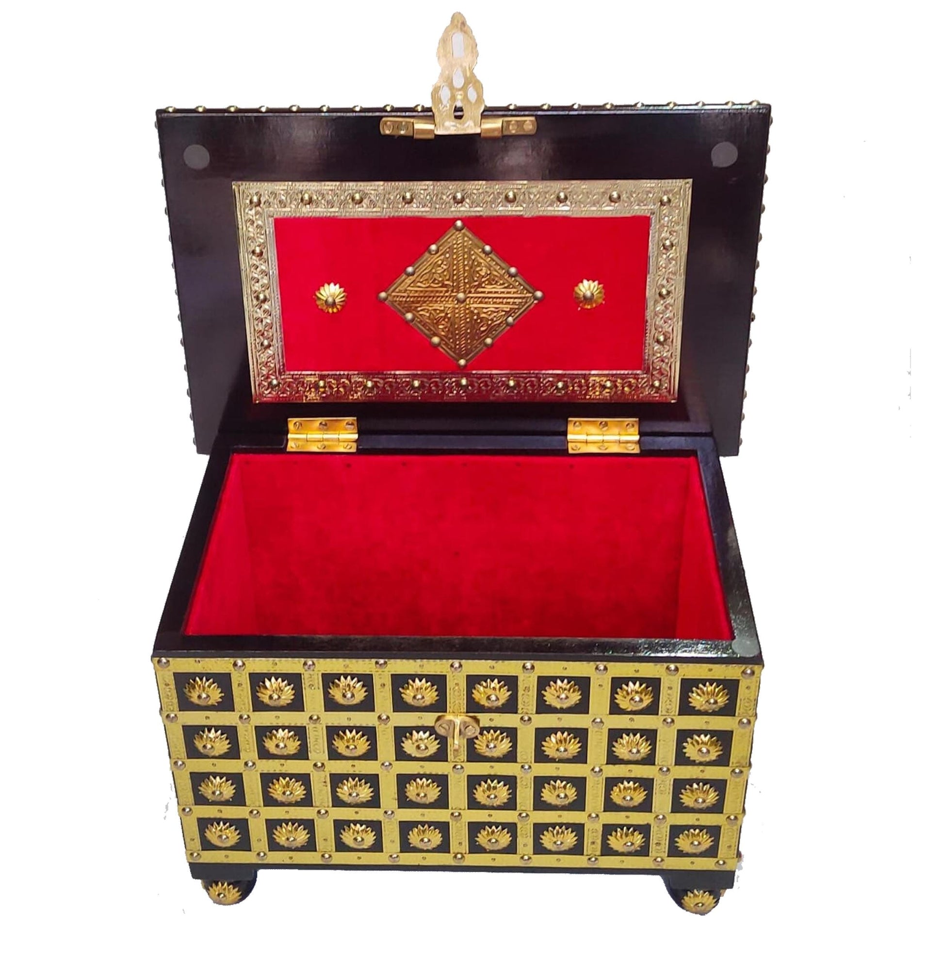Handmade Wooden Storage Trunk: Carved Brass Decor, Medium Size