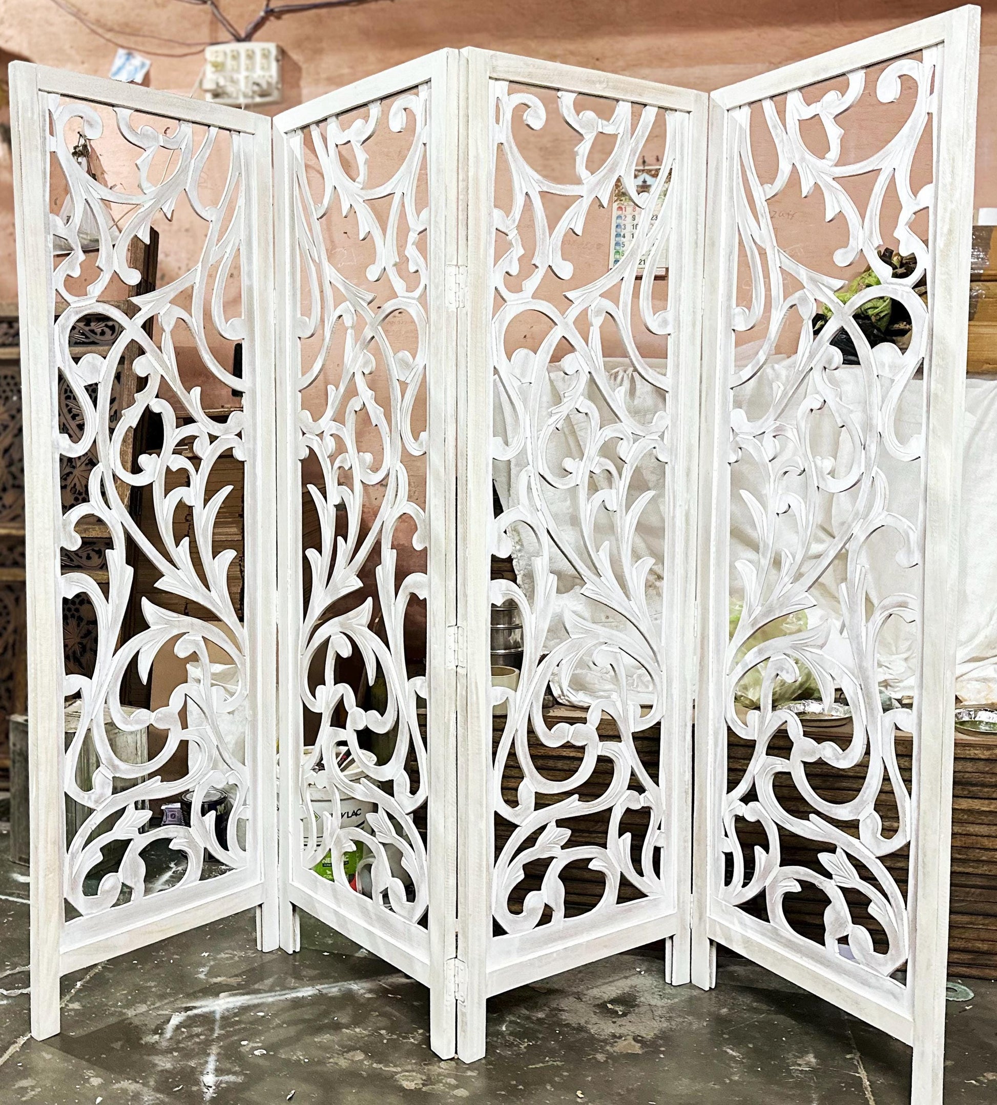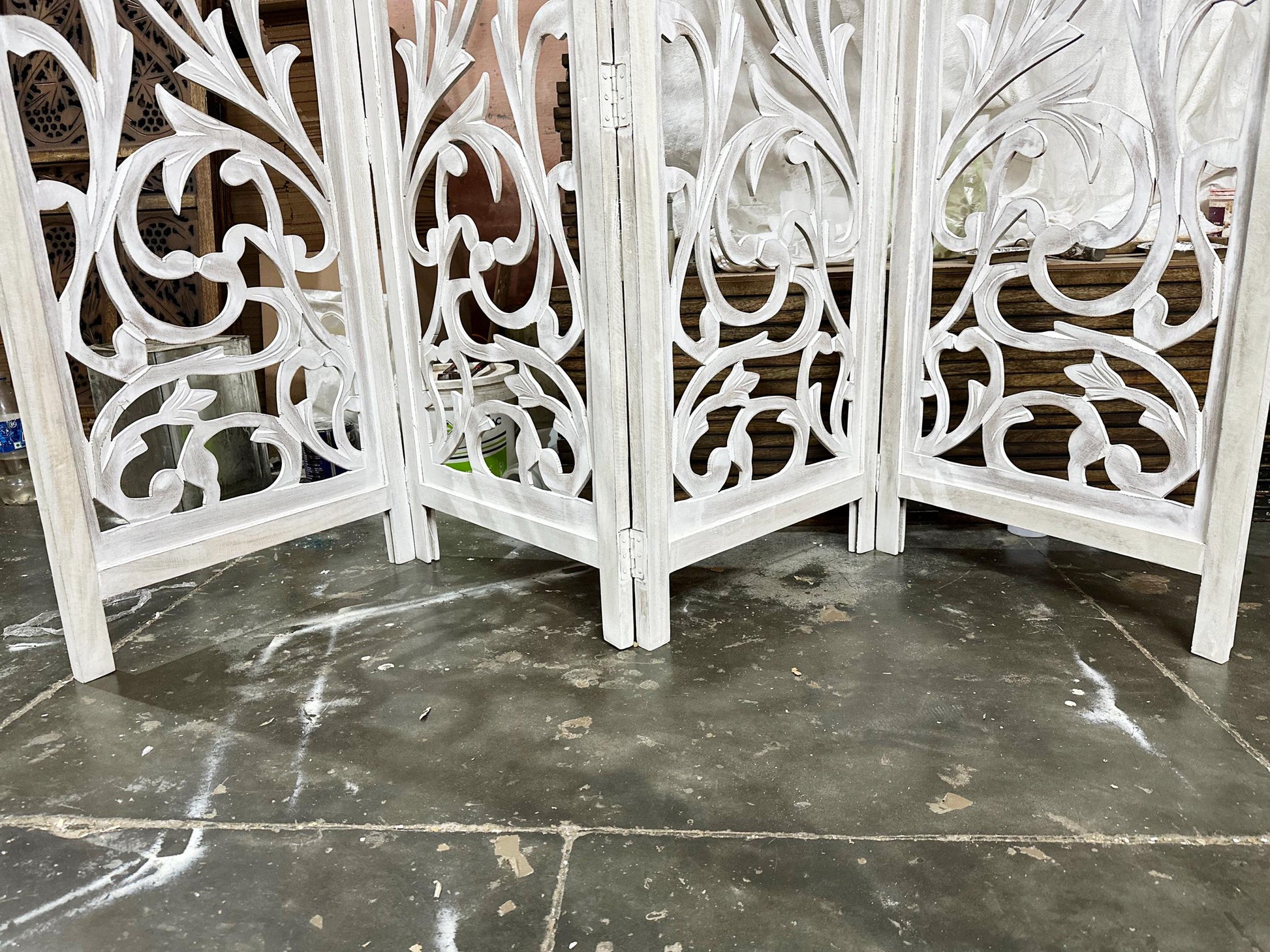 Mid century Floral design Rustic White Wooden Folding Divider, Partition, Handmade Self standing screen
