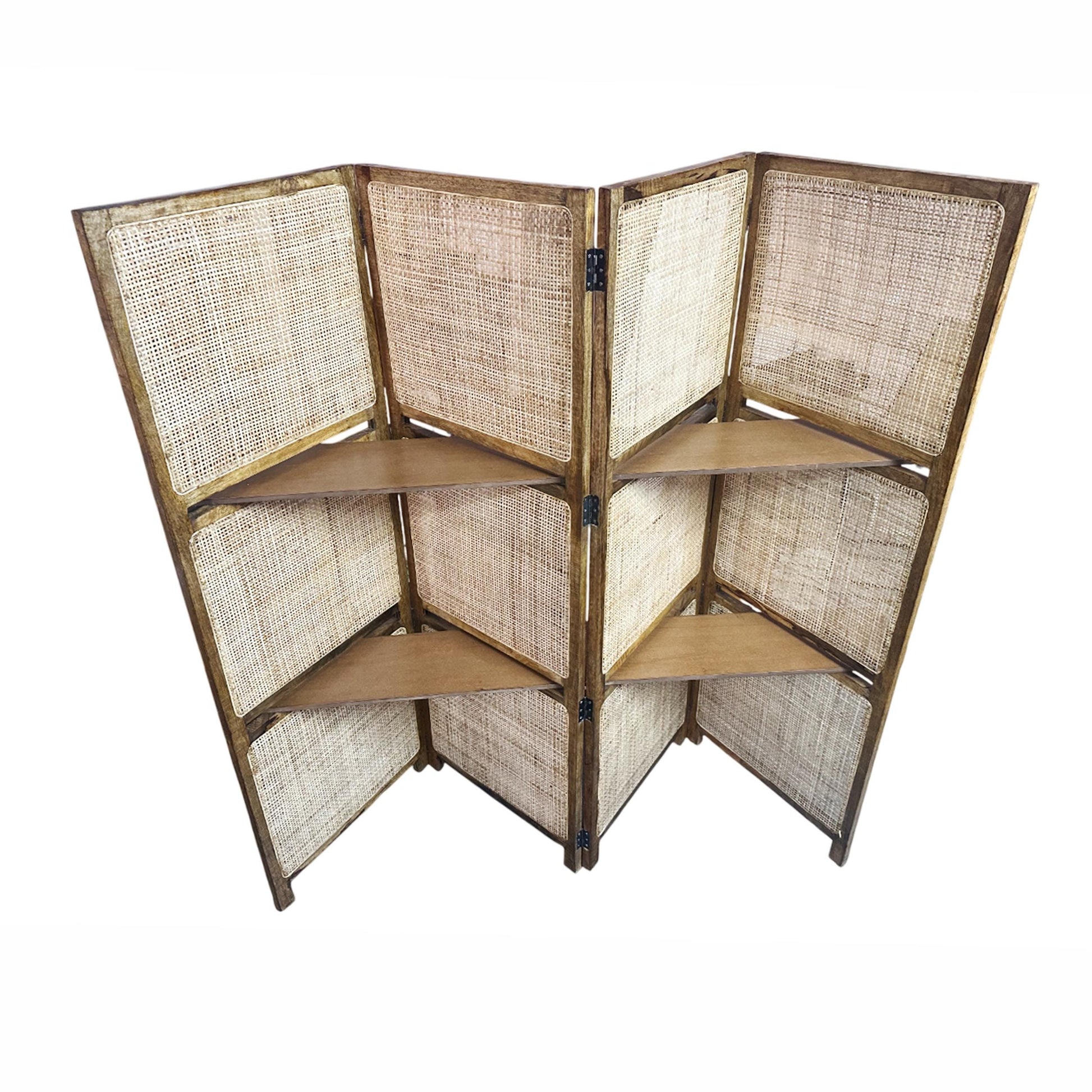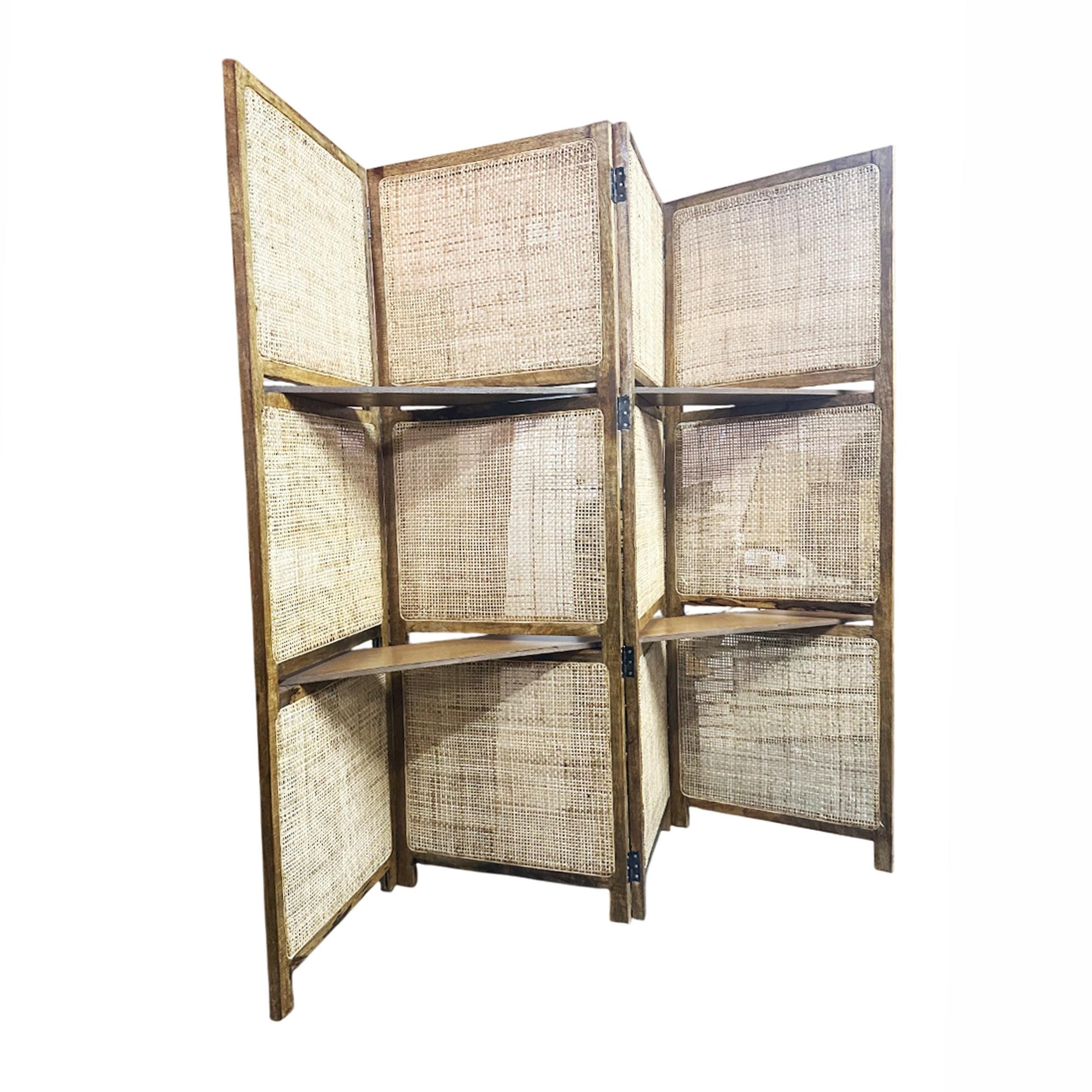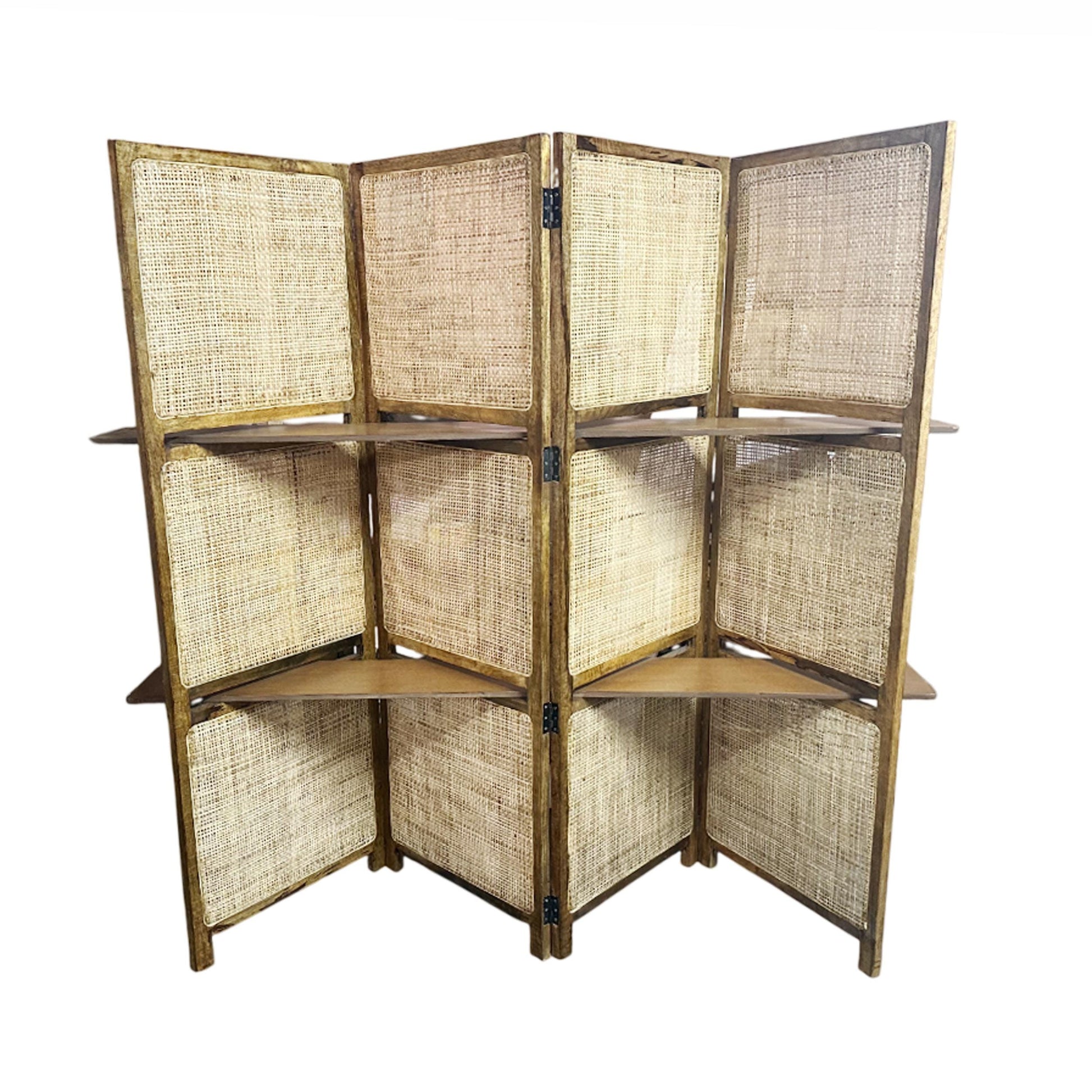 Natural Rattan cane Room partition Screen with shelf , Folding Divider, Mid-century Separator shelf organiser
